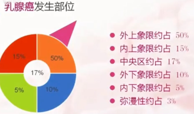 超声影像最终的目的是要找出乳腺癌,做乳腺检查的人络绎不绝。那什么是乳腺癌呢?它有什么危害呢?乳腺癌是指发生于导管上皮,及末梢导管上皮的恶性肿瘤。乳腺癌的危害,一是致残摧毁女性的自信。二是发病率及死亡率在所有恶性肿瘤中排名第一。对家庭的危害极大,妇女能顶半边天,半边天没有了,这个家就相当于塌了一半。乳腺癌的常见发生部位,外上象限约占50%,内上象限约占15%,中央区约占17%,外下象限约占10%,内下象限约占5%,弥漫性约占3%。乳腺癌术后5年生存率一期:80-90%,二期:60-70%,三期:40%。因此 提高乳腺癌生存率和降低死亡率的关键在于早发现早诊断早治疗。