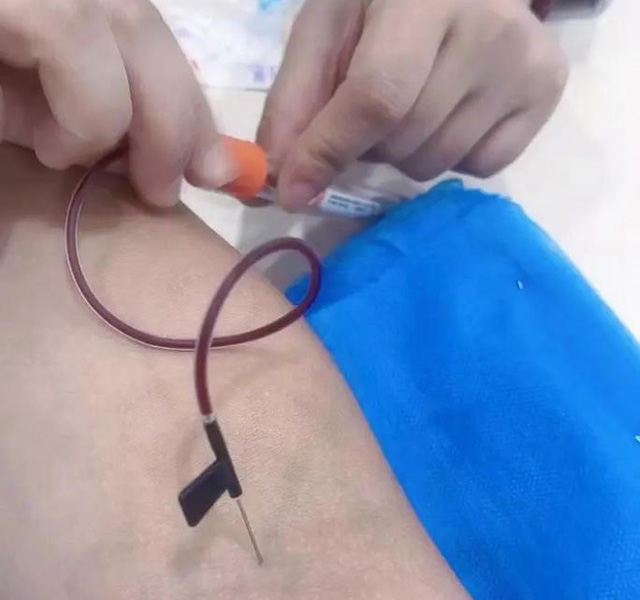 血管带一定要扎紧,血管才会充盈。然后握拳可以看到血管。血管扁的不明显的话就轻轻的拍一下。不需要用力的打这样可以清晰的看到血管。血管比较细的话。扎血管的地方消毒两次,采血针打开后。看到的两头都是针,针的一头插进血管,另外一头插到管引血液。血液抽的差不多时候就用大拇指顶着管头。血就流不出来了。然后解开止血带,取一根干棉签。然后把管的针拔出来就可以了。进针角度大时候不疼但容易漏针,进针角度小时候有点疼不容易漏针。进针的角度为15度-30度不容易漏针也不疼。