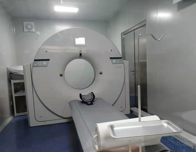 胸部CT是新冠的诊断跟治疗的检查手段之一。但是它有传染性,在影像中心检查的交叉传染感染性的风险很高。所以方舱CT的研发面世。可以将感染者跟疑似感染者跟普通病人隔离开来检查这样就不会有交叉感染的风险。方舱CT的选择CT的扫描标准,设备是40排80层,实现与患者和家属真正不接触,最大限度的避免接触感染。它的位置选择一般在医院的发热门诊旁边。放在硬化地块上面还要通水通电。方舱CT专用通道并预留了工作人员专用通道,配置隔离带和发热或疑似新冠肺炎患者专用通道。 方舱CT作为特殊情况下的CT检查,有铅板围挡的密闭空间内,箱体外侧镶嵌有保温材料、防雨材料和防雷电设施,在箱体外侧和过道贴有电离辐射警告标识。方舱CT 机房均通过第三方检测机构依据GBZ130-2013《医用X射线诊断放射防护要求》[2]、GBZ264-2015《车载式医用X 射线诊断系统的放 射防护要求》[3]及GB 18871-2002《电离辐射防护与辐射 安全基本标准》[4]进行检测并通过。