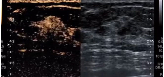 乳腺检查新技术,包括了三维超声,超声造影以及弹性成像技术。说到三维超声,大家可能比较熟悉的是胎儿的三维超声。其实这种技术也广泛应用在乳腺癌诊断上。乳腺癌的三维超声图像呈太阳光芒征,跟二维图像对比。直观显示了肿瘤对周围组织的浸润改变,超声造影是通过静脉注射超声造影剂。来增强人体的血流信号,可以实时动态地观察组织的微血管灌注信息。提高对病变的检测率和对病变的良性、恶性肿瘤进行鉴别。超声造影表现为不均匀增强,病灶造影测值增大。是典型的乳腺癌超声造影表现。