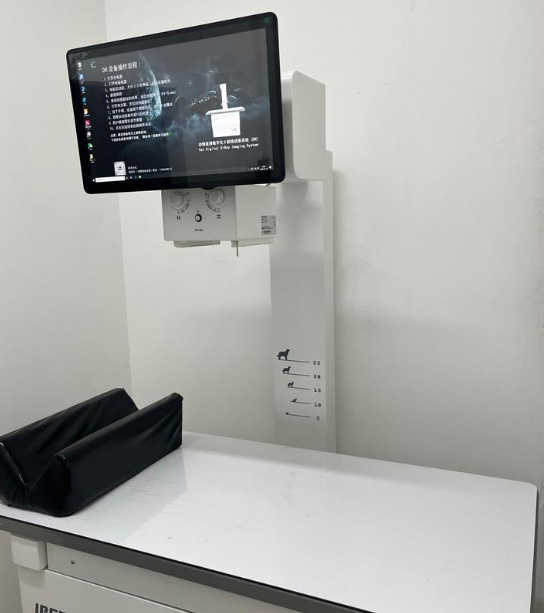 这就是宠物专用的宠物DR影像系统,检查设备非常重要。快速判断病情DR系统由于它成像快的优点,现在已经在宠物医院广泛的使用的仪器设备。都是比较有实力的宠物医院。可以在动物动态情况下进行DR摄片检查。DR的作用在临床中拍片子,可以看有没骨折、有没有膀胱石,有几个胎儿等等,DR的手术床可以活动的方便我们中间去选位置,可以跟这个大小调整位置。铅衣是做拍摄防护的,选择拍摄部位,腿部、胸部、前肢等。不同部位的值也是不一样的。千伏毫秒都不一样。